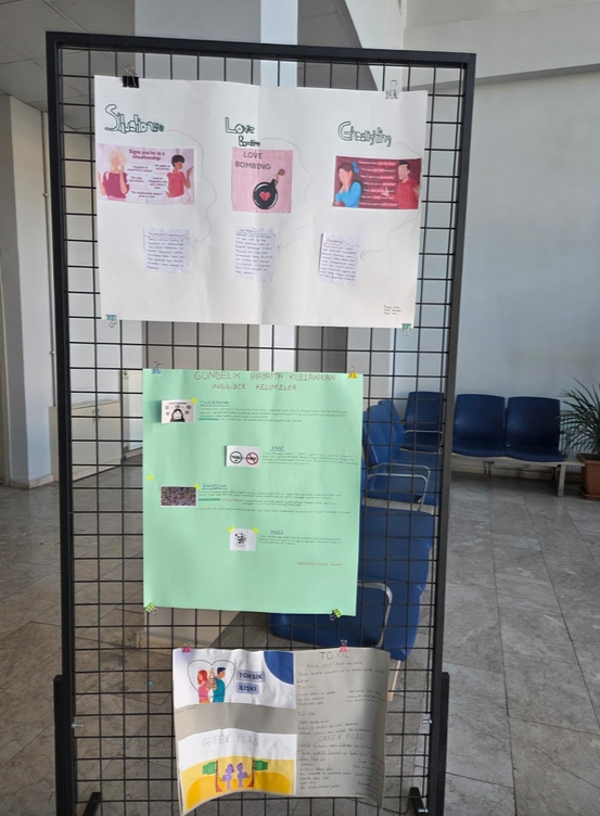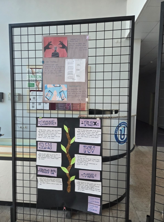 As part of the event, first-year students prepared various posters highlighting the Turkish equivalents of English words frequently used in daily life, social media posts, and interpersonal communication. The visual materials displayed popular English expressions commonly used among young people together with their corresponding Turkish meanings through engaging visual presentations.
