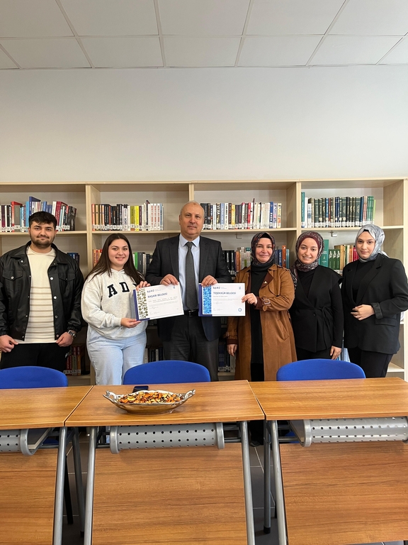 During the program held at the Vocational School, faculty members and students who contributed to the development of a scientific research culture, along with participants involved in community-oriented social responsibility efforts, were honored. At the ceremony, achievement certificates were presented to the students and their advisors involved in TÜBİTAK-supported projects, while the teams who created awareness through their social responsibility work also received certificates of appreciation.
